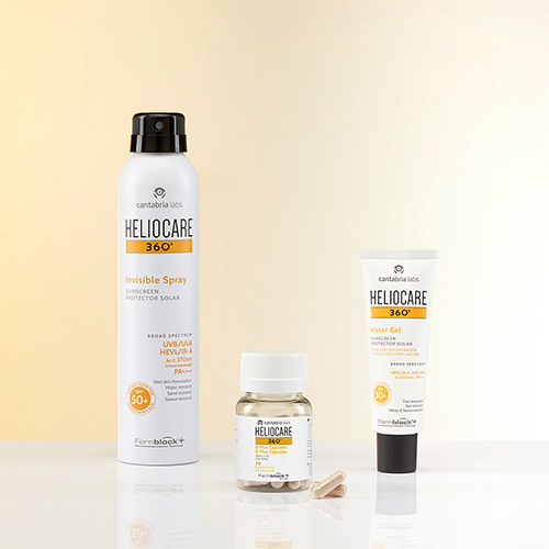 Genom att kombinera Heliocares solkrämer och kosttillskott får du ett komplett skydd från topp till tå – med skydd mot fyra typer av strålning (UVB, UVA, synligt ljus och infraröd strålning) samt hjälp att reparera UV-relaterade hudskador.